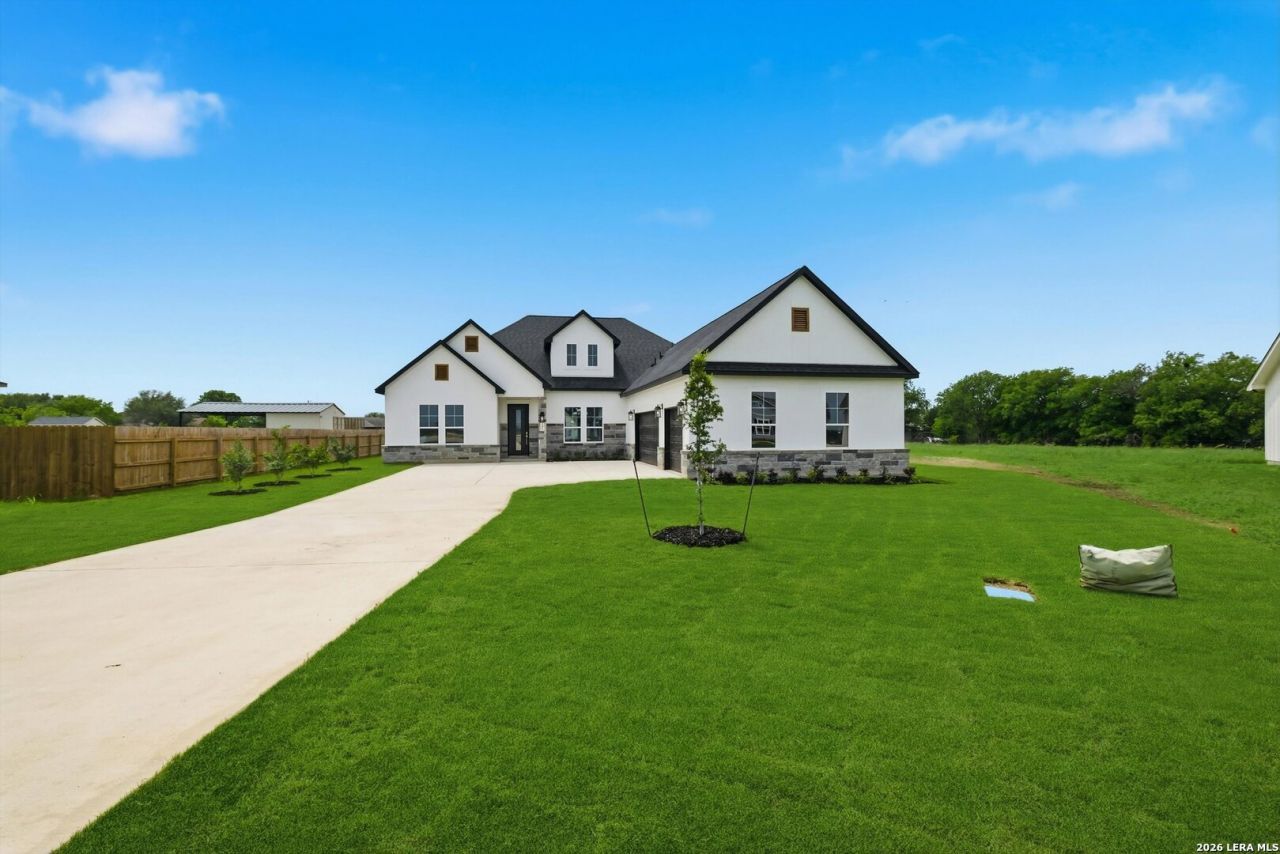 Discover the space and privacy youve been looking for in this beautifully designed single-story home in Paraiso, offered under $700K. Set on a level 1-acre lot, this 4-bedroom, 3.5-bath home delivers a rare combination of room to breathe and everyday convenience-no interior steps throughout. The open-concept layout features two dining areas, a spacious living room with a Texas-style fireplace, and a gourmet kitchen with built-in appliances, 42" cabinetry, hardware, and a striking herringbone backsplash. A dedicated study/office adds flexibility for work or hobbies. The oversized primary suite includes a sitting area and a spa-like bath with a large walk-in shower, dual shower heads, and a rain head. Secondary bedrooms are generously sized, with one en-suite and two connected by a Jack-and-Jill bath. Ceiling fans are installed in all bedrooms and main living areas for added comfort. Exterior highlights include a stucco and stone facade, a side-entry three-car garage with EV charging capability, an extended driveway for ample parking, and a courtyard-style covered patio-ideal for relaxing or entertaining. Located in a gated community with convenient access to H-E-B, major highways, and just under 30 minutes to Lackland AFB. Zoned to Medina Valley ISD.